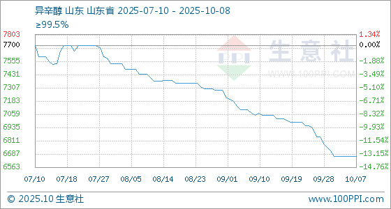 10月8日,生意社异辛醇基准价为6666.67元/吨,与本月初(6716.67元/吨)相比,下降了0.74%。