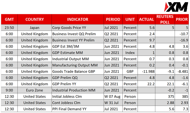 英国的国内生产总值数据显示,英国经济在第二季度稳定增长4.8%,年增长率达到22.2%,但英镑几乎毫无反应。接着今日稍晚时,可以关注美国生产者物价指数和每周失业救济金申请人数。不过除非出现任何大型意外,否则这些数据多半不会过度刺激美元。