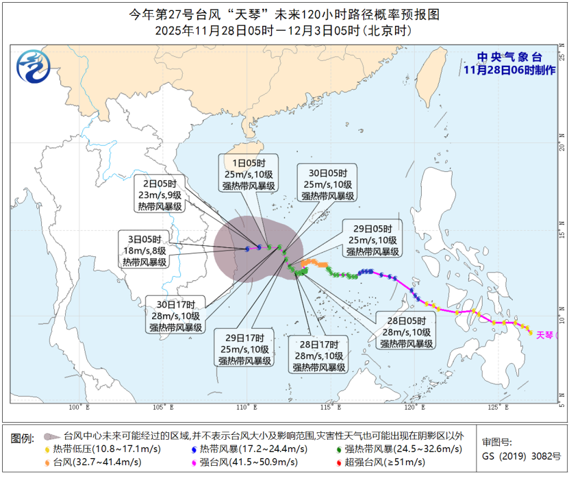 今晨7时,台风“天琴”的中心位于海南省三沙市(西沙永兴岛)偏南方向约490公里的海面上,强度为强热带风暴级(10级,28米/秒)。预计其28日白天将回旋少动, 28日夜间开始逐渐转向北偏西方向移动,强度缓慢减弱。