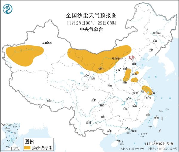 受冷空气活动影响,北方部分地区有沙尘天气。预计28日至30日,内蒙古中西部、甘肃河西地区、宁夏、陕西中北部、华北北部等地的部分地区有扬沙或浮尘天气。