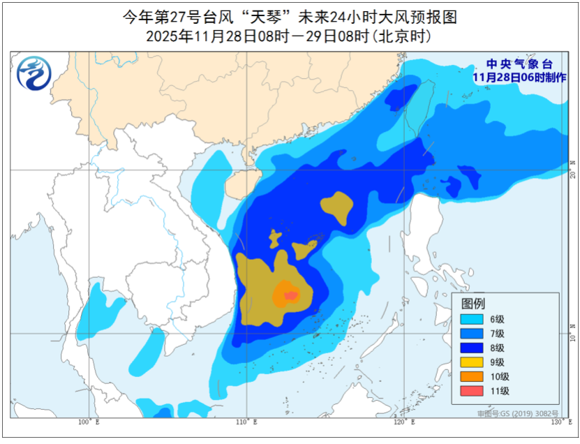受“天琴”和冷空气的共同影响,台湾海峡、台湾以东洋面、巴士海峡、南海大部及东沙群岛、西沙群岛、中沙群岛、南沙群岛、黄岩岛附近海域、北部湾、台湾沿海、福建沿海、广东沿海、海南岛东部沿海将有6~8级大风,其中,南海中部和西南部的部分海域风力可达9级,“天琴”中心经过的附近海域风力可达10级,阵风11~12级。黄岩岛、中沙群岛将有大到暴雨,局地有大暴雨(100-150毫米)。