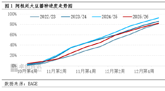 根据阿根廷布宜诺斯艾利斯交易所的数据显示,截止2025年12月30日,阿根廷大豆播种进度为82%,环比增加6.5%。前期充足的降水,加速了产区北部的播种进度,目前已播种大豆的区域中,96.1%的作物生长状况为优秀和正常,同时97%的地块土壤水分为极佳和适宜。与此同时,17.3%的第一茬优质大豆已进入生殖生长阶段,第二茬普通大豆的播种作业已完成计划面积的71.9%,出苗率整体良好,仅部分积水的地块需要进行补种。从今年的整体播种走势看,虽然整体落后于去年同期,但从环比看中后期的播种速度仍旧较快,因此价格对于数据的同比滞后反馈清淡。
